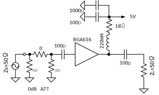 入力部にはアンプ入力R.L.の改善用アッテネータを挿入できるようにしています。BGA616のVD最大値は4.5Vなので、5V動作させるときには制限用抵抗が必要になります。IDを60mAにした時のVDは約4.0Vになっていました。