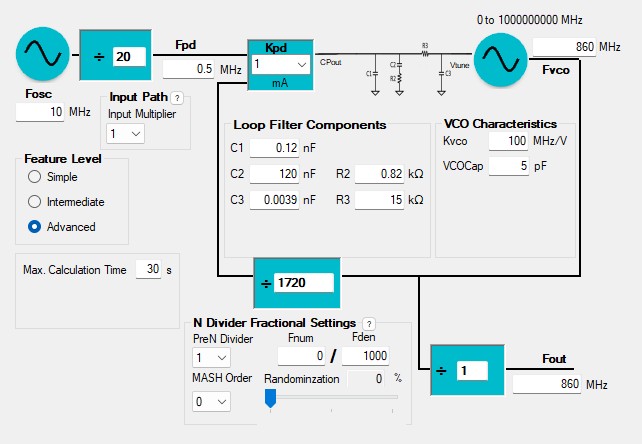 基準信号周波数が10MHz、位相比較周波数を500kHzとし出力周波数を860MHzとしました。KVCO(VCO感度)を100MHz/Vとし計算させました。計算されたループフィルタは次のようになりました。