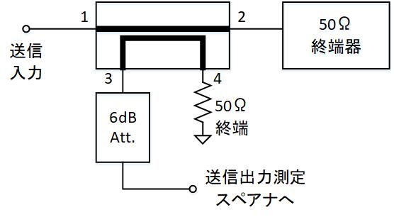 送信アンプの出力が20W(+43dBm)以上としたとき、前述のカプラ結合度-13dBでは結合出力が+30dBmとなりこのままスペクトラムアナライザに入力するには危険です。安全のためポート3に6dB程度のアッテネータを挿入します。